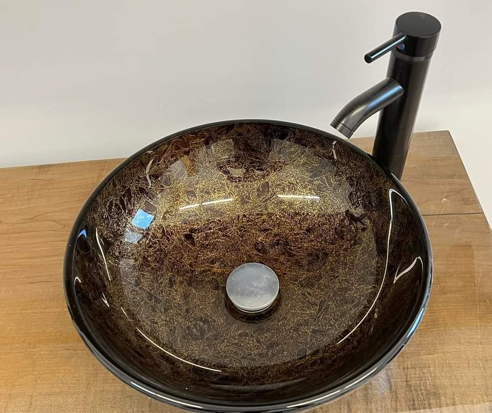 Elevate your bathroom with an updated look with our maple vanity, featuring a solid live edge top, oil rubbed bronze facet and tempered glass vessel sink