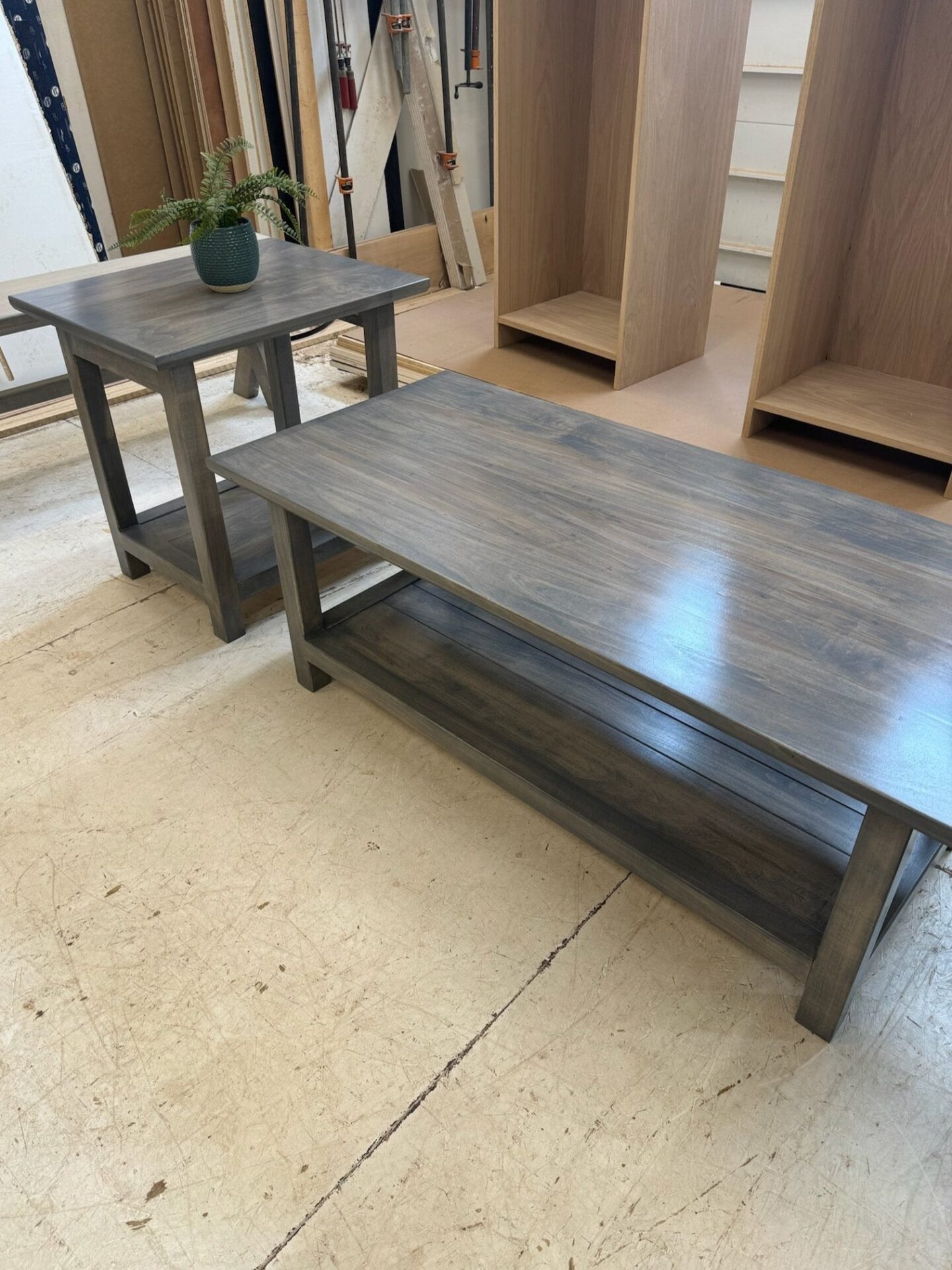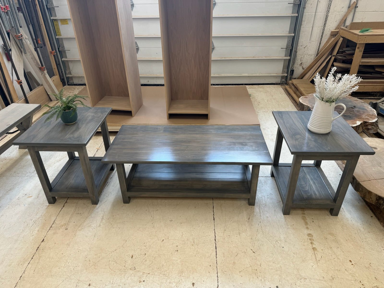 Achieve the ideal balance between natural and contemporary design with our handmade modern living room table set, showcasing a sleek grey finish over the hardwood tabletops and legs